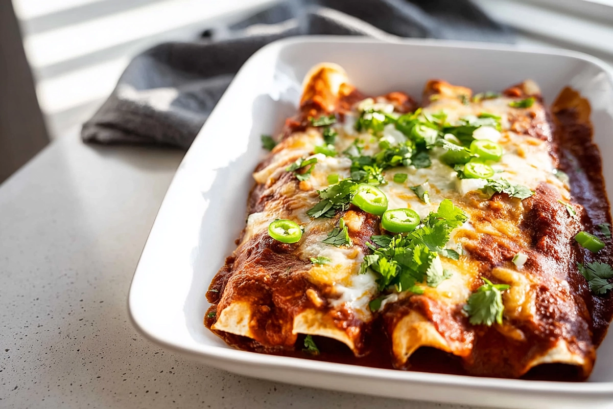 Lightly warm the tortillas before rolling, avoid overfilling, and don’t oversaturate them with sauce before baking. A balanced amount of sauce ensures the enchiladas stay tender without becoming mushy.