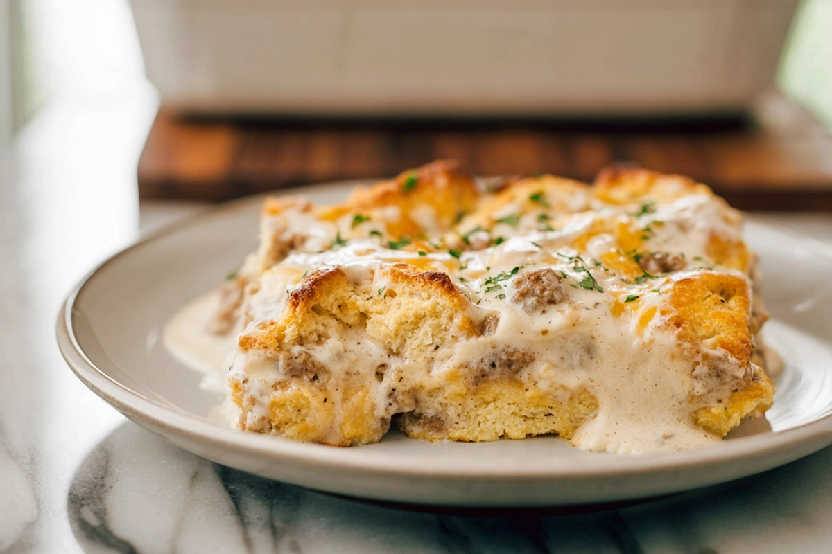 A hearty Southern-inspired breakfast casserole featuring golden buttermilk biscuits, creamy sausage gravy, and melted cheddar cheese. Perfect for brunches, holidays, or cozy family mornings.