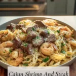 A comforting Cajun shrimp and steak Alfredo pasta made with tender ribeye, juicy shrimp, and a creamy homemade sauce. This homestyle surf and turf dinner feels special while staying practical for real home kitchens.
