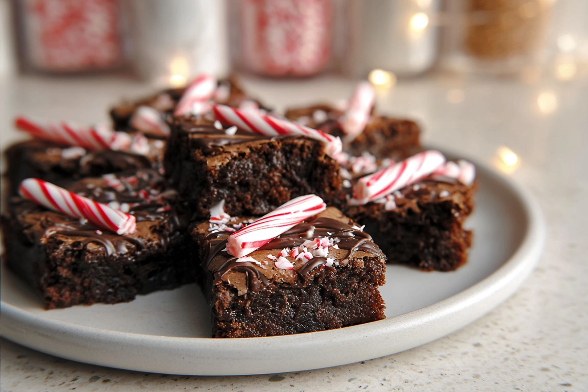 Rich and fudgy candy cane brownies made with deep chocolate flavor and a gentle hint of peppermint, finished with melted chocolate and festive candy canes for a cozy holiday dessert.