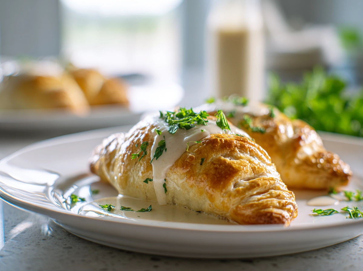 | Vegan | Use plant-based chicken (e.g., soy or pea protein shredded “chicken”), vegan cream cheese, vegan butter or margarine, and vegan crescent dough or puff pastry. Use nutritional yeast or vegan Parmesan substitutes. Replace dairy milk with oat, soy, or almond milk. |