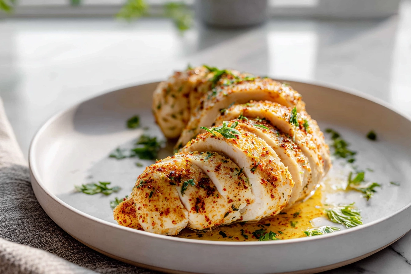 Pat the chicken breasts dry to help the seasonings stick. Drizzle with olive oil and coat with your mix of salt, pepper, garlic powder, paprika, and herbs. If you have time, let the chicken sit for 10–15 minutes so the seasoning can soak in.