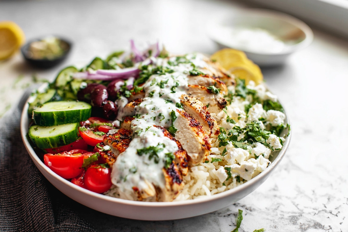 Slice the chicken across the grain and lay it on top while it’s still warm. Spoon the tzatziki on last so it stays cold and creamy, then finish with a light drizzle of olive oil and lemon juice if you want extra brightness. These bowls are complete on their own, but they pair especially well with something crisp on the side—think roasted potatoes or warm pita—to soak up whatever’s left behind.