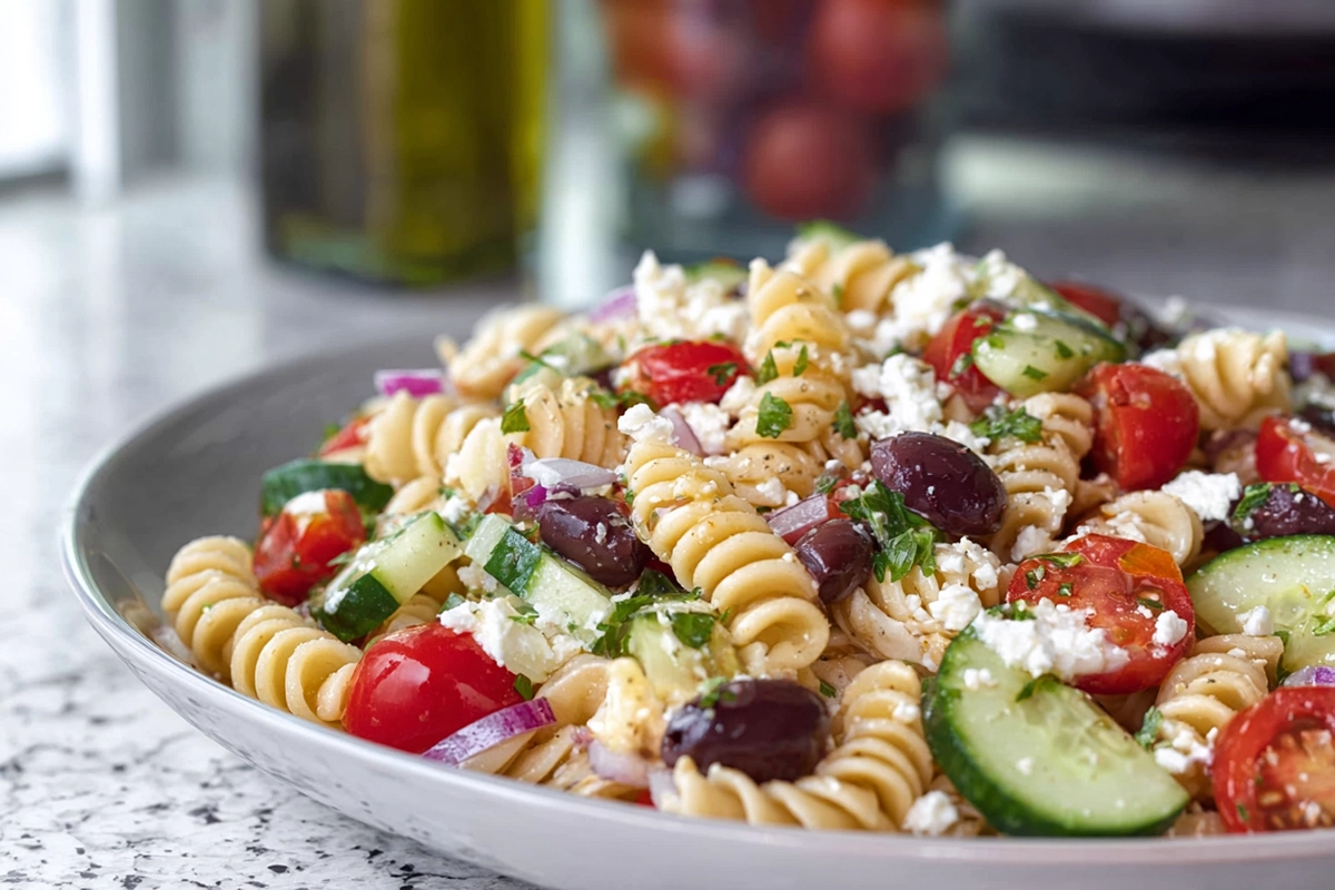 A refreshing Mediterranean-inspired salad made with rotini pasta, crisp vegetables, olives, feta, and a bright Greek vinaigrette.