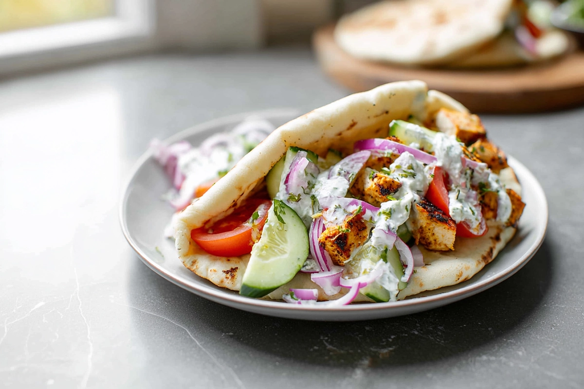 Warm your pita until soft and pliable. Add sliced chicken, spoon on tzatziki, then pile on vegetables. Fold it up, take a bite, and you’ll notice how every element supports the others.