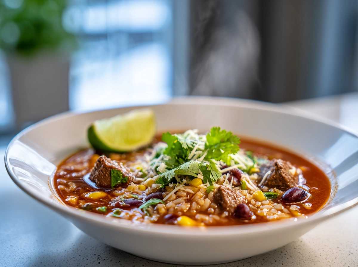 A hearty, comforting soup with tender beef, fluffy rice, beans, and corn simmered in a tomato-based broth, finished with fresh cilantro and lime for vibrant flavor.