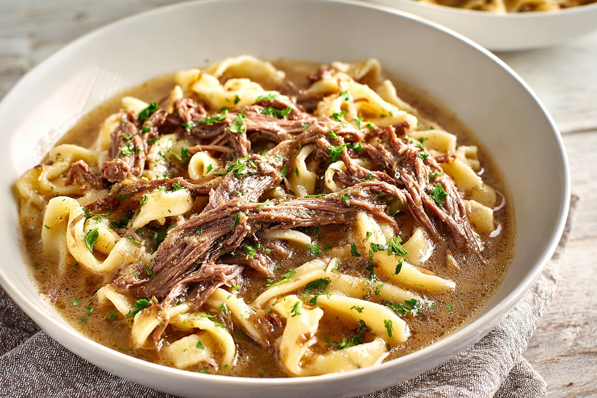 This slow cooker beef and noodles recipe delivers tender shredded beef, rich gravy-coated egg noodles, and warm comforting flavor with almost no effort.