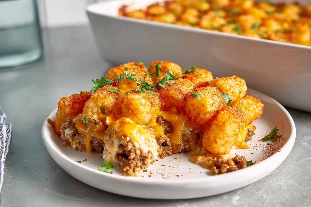 A warm and comforting casserole made with seasoned ground beef, a creamy sauce, melted cheddar cheese, and a crispy golden tater tot topping that brings nostalgic Midwestern hotdish flavor to your dinner table.